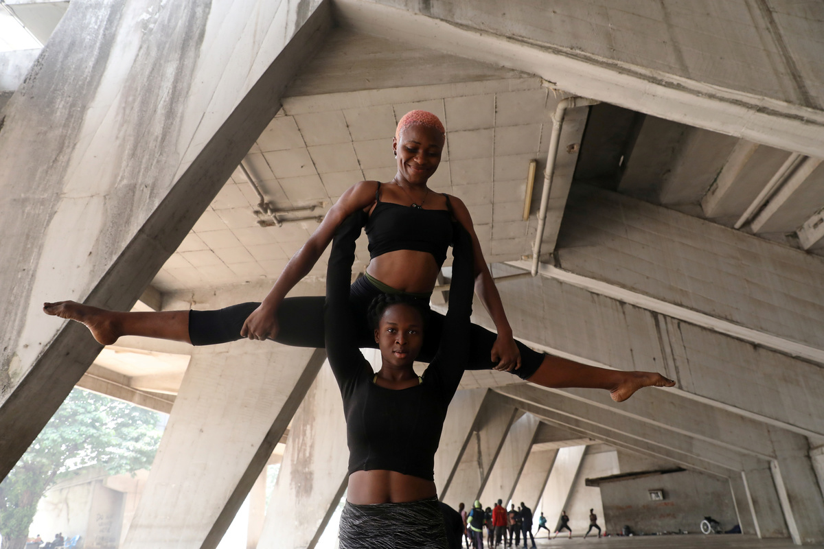 Ifeoma Amazobi and Oyindamola Kolawole perform contortions during rehearsals at the National Stadium in Lagos, Nigeria January 27, 2020. Picture taken January 27, 2020. REUTERS/Temilade Adelaja