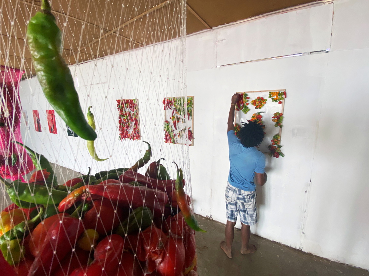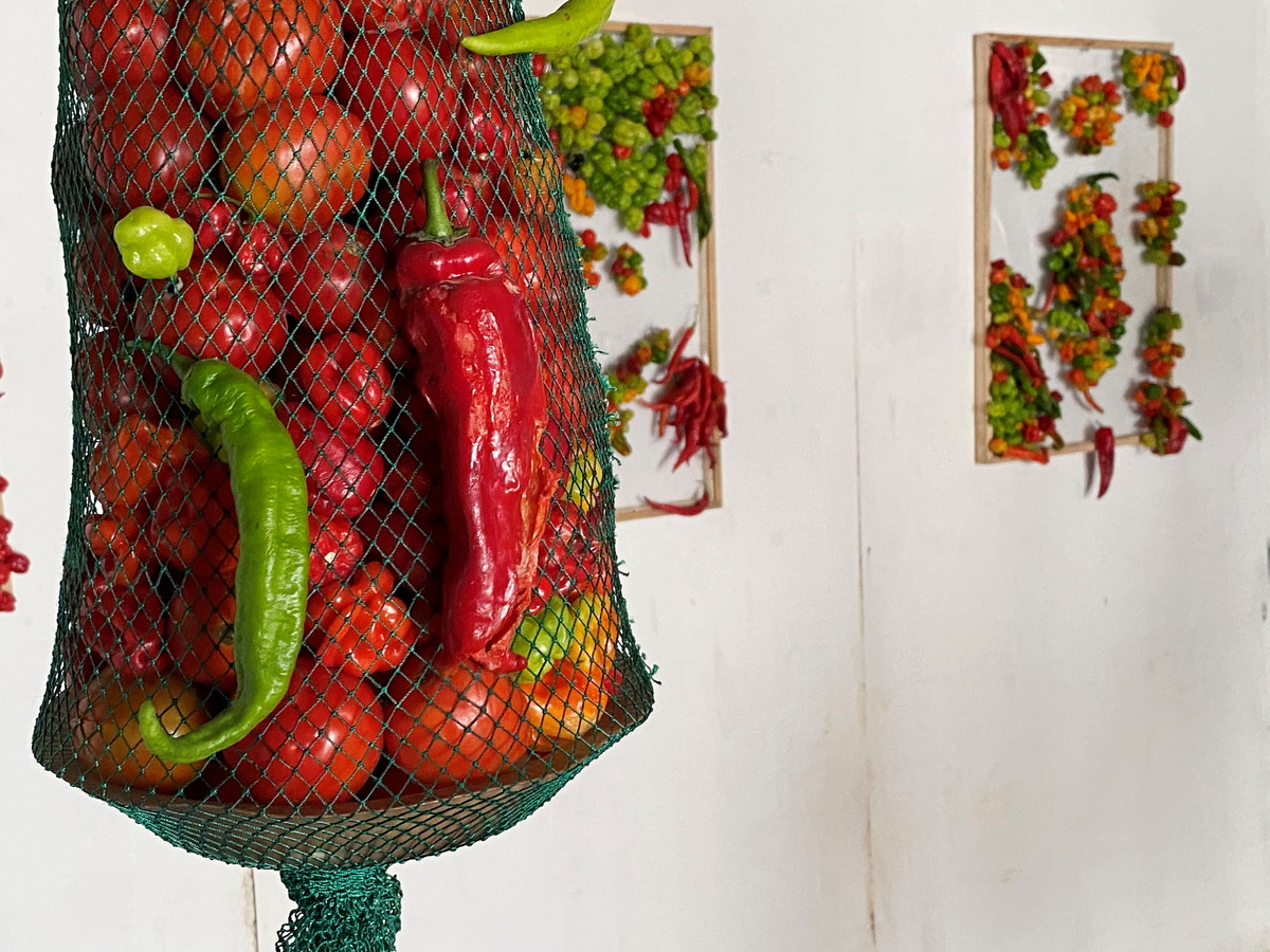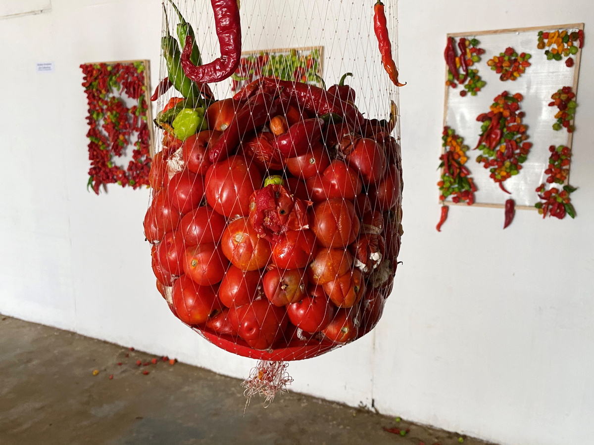 His pieces, comprising of red, yellow and green peppers mounted on boards and tomatoes hanging from nets, will rot during the lifespan of the exhibition in Lagos. The decay reflects the food wasted during lockdowns last year, said the 30-year-old artist.