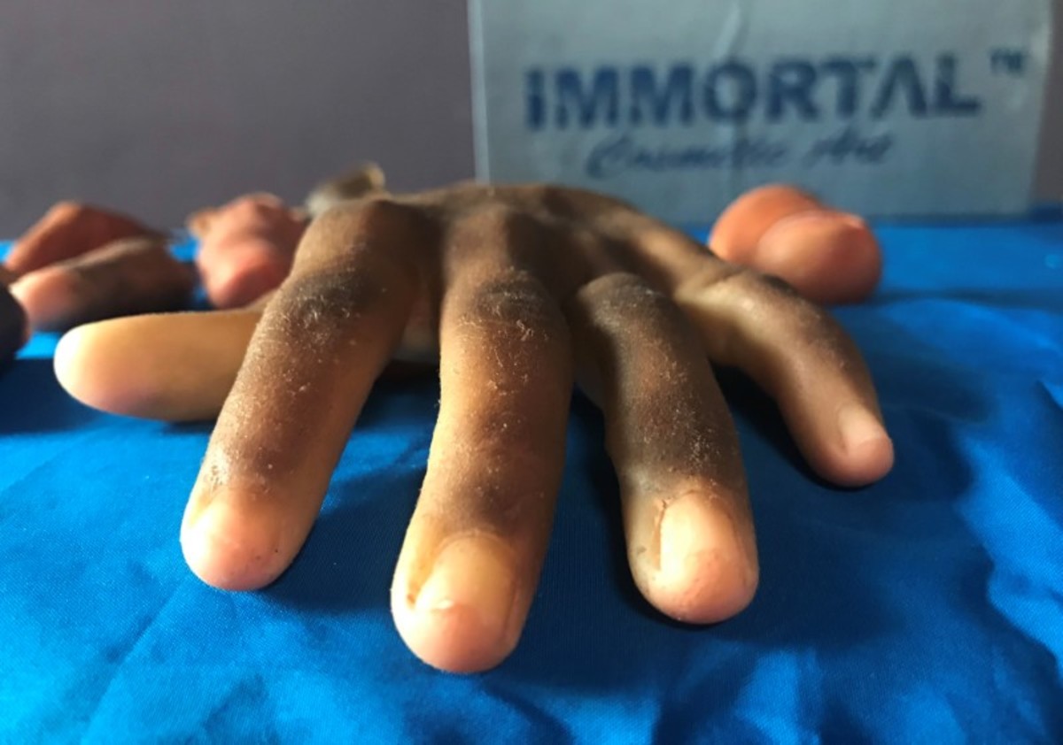 The prosthetic has a hyper-realistic feel and, unusually, is dark in color, matching perfectly the tone of Sunday's skin.