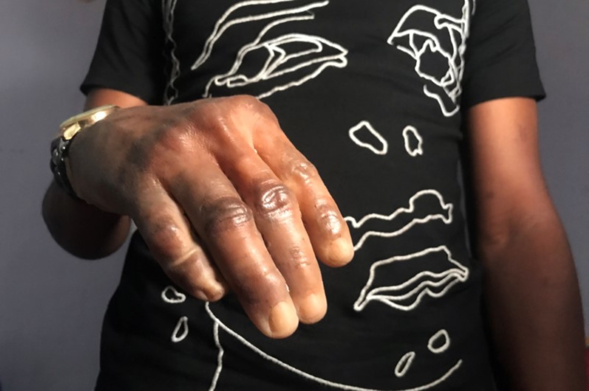 Michael Sunday is delighted, if a little stunned, as he admires his new right hand: a silicone glove-like prosthetic meant to help him return to normal life after he lost three fingers in a car accident a year ago.