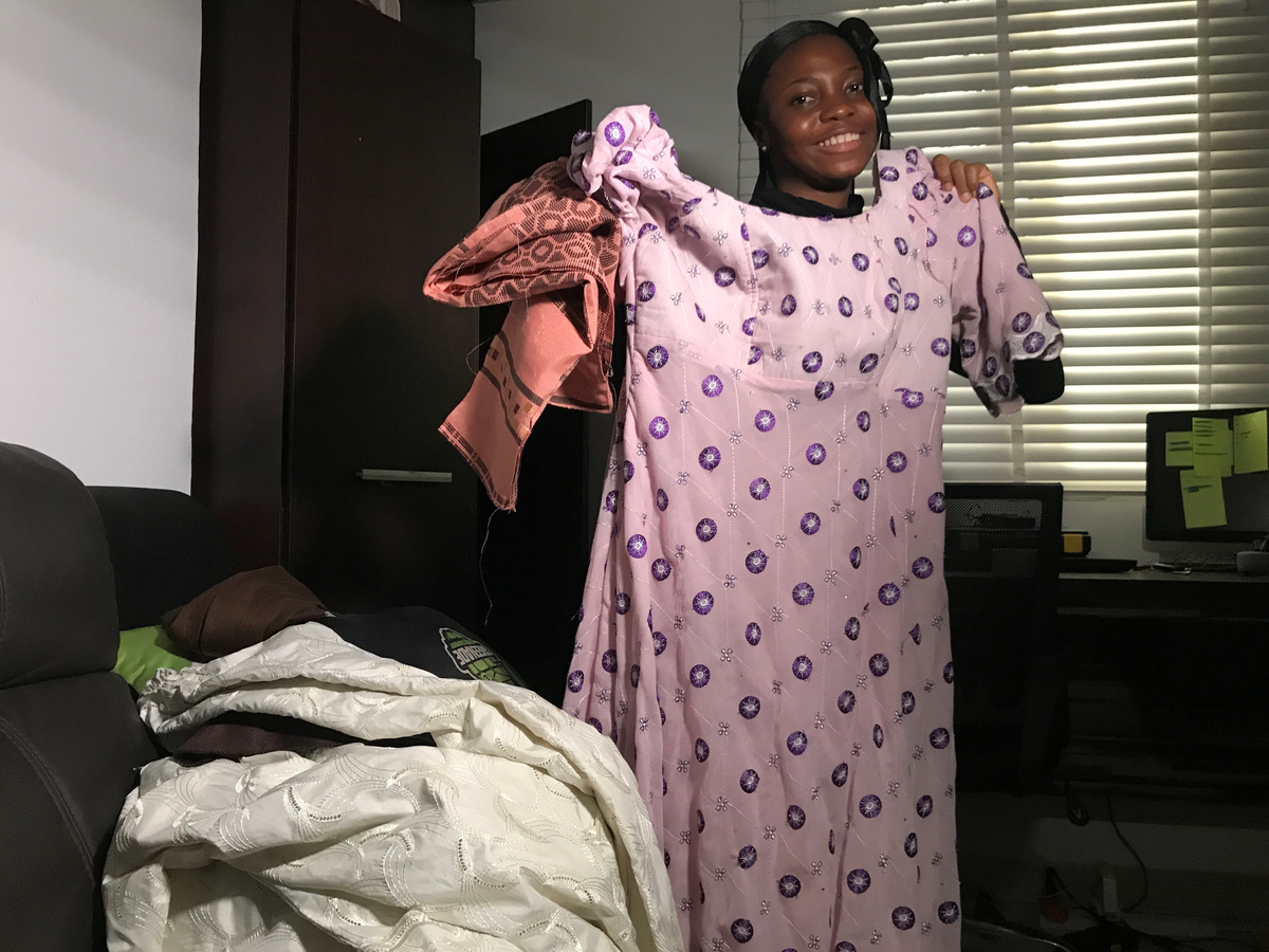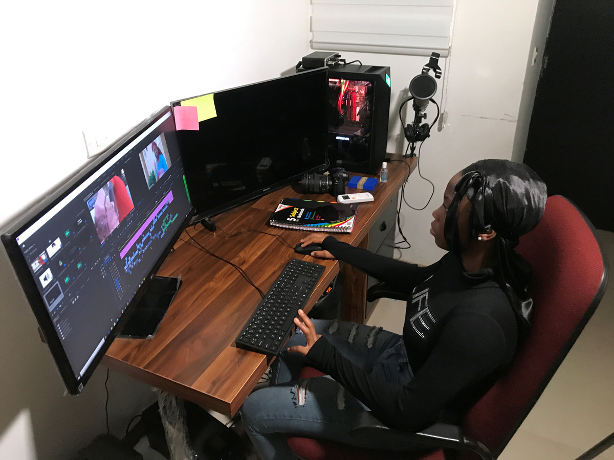 In one of her online videos, she plays the role on an all-knowing, all-controlling Nigerian mother who watches in horror as a young man sneezes into his hands.