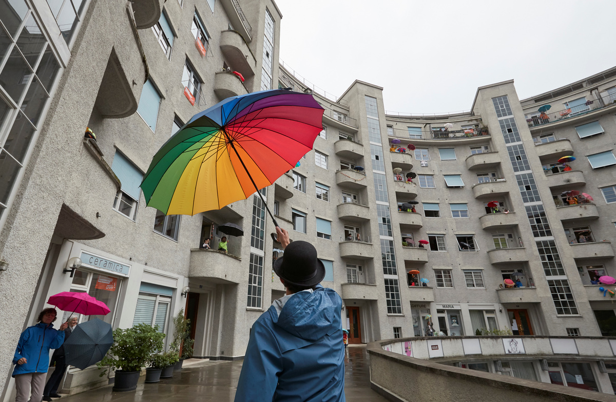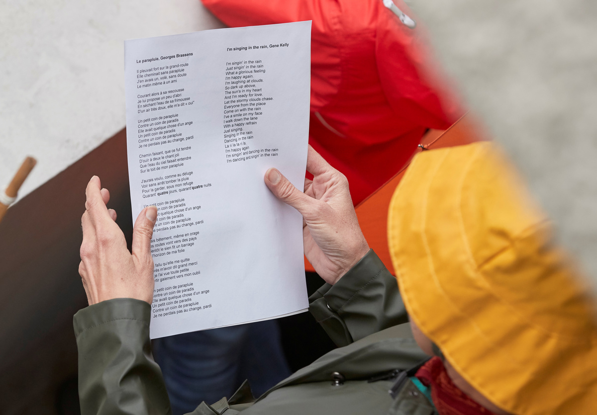 Dressed in a black trench coat and hat, 36-year-old Audrey Lecomte performed "Singing in the Rain" on a drizzly Tuesday evening to the residents of Geneva's Round House apartment complex, who twirled umbrellas from balconies to the music.