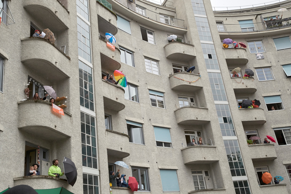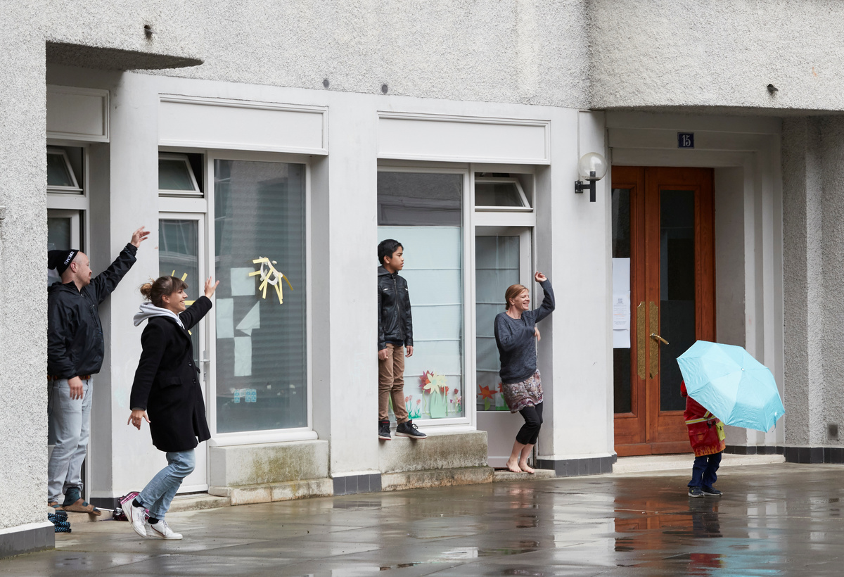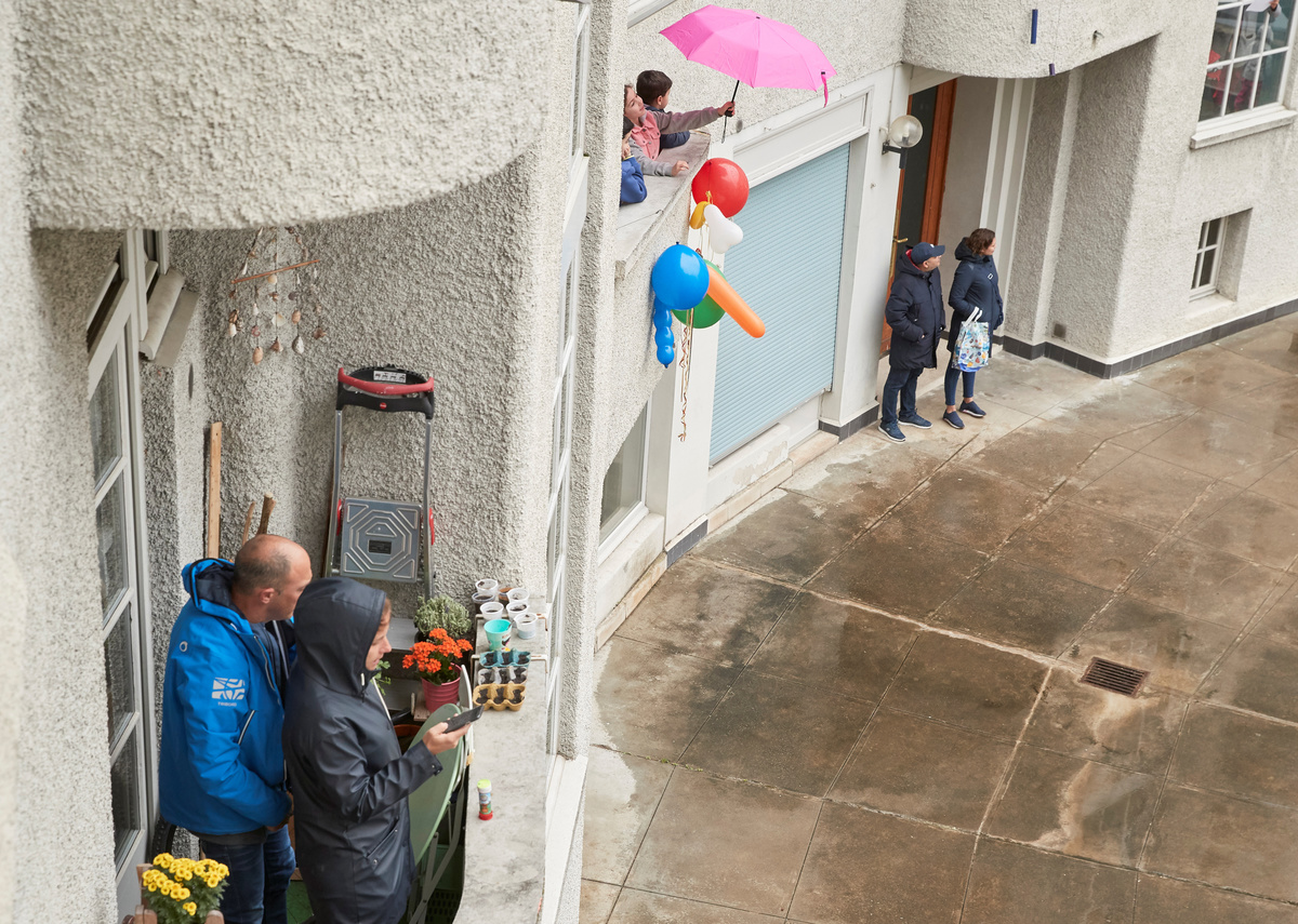 The dozens of kids in the building look forward to the evening "show" and passers-by stop and watch with kids and dogs. "The children, who can't play with each other, they at least get to see each other," said Tessa, a resident and 39-year-old speech therapist and mother of two young boys.