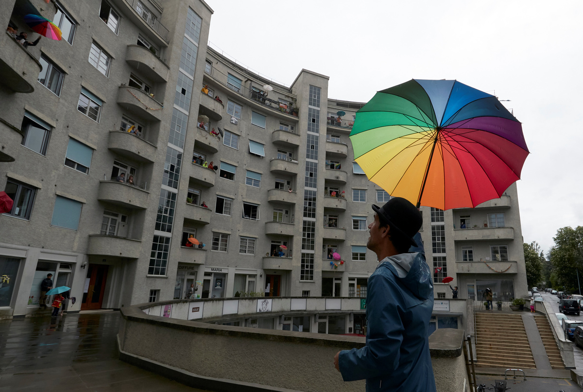 The nightly 6pm "choir" at the 1920s block, a 6-storey architectural monument built in a semi-circle, has become a way to cheer each other up during Switzerland's national lockdown to stop the spread of COVID-19, now in its seventh week.