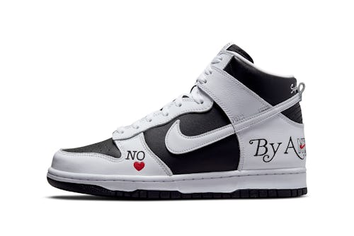 If someone in the design room for Supreme asked how much text should be used for its SB Dunk High, the answer must have been a firm “yes.” The sneaker is a crowded affair likely to split sneakerheads between viewing it as corny or a perfect encapsulation of Supreme’s attitude.