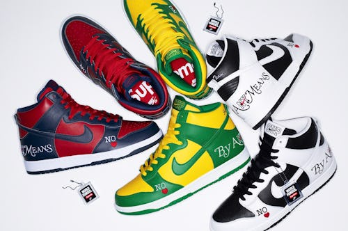 Supreme’s trio of Nike SB Dunks is expected to release at 11 a.m. ET on March 3, with pairs available on the streetwear brand’s website and in-stores. Prices for the footwear have yet to be announced, but it’s guaranteed each pair will resell for thousands: Nike and Supreme may be draining their appeal, but there’s always someone out there willing to pay big for what little hype is left.