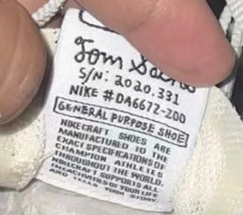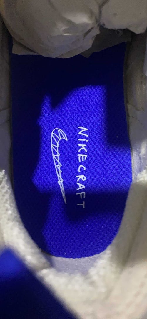Nike’s retro logo appears on the outer royal blue tongue tab, but its underside features a guarantee that the shoes are “manufactured to the exact specifications of athletes around the world.” Other details on the tongue include the serial number and Tom Sachs’s signature.