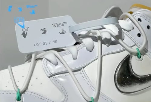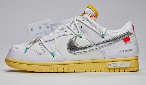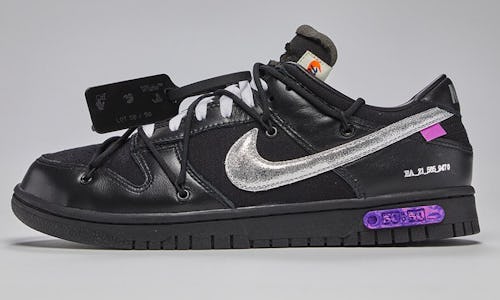 Off-White references its all-white 1/50 and all-black 50/50 Dunk Lows in its release messaging: “Exploring the Off-White motto of ‘defining the grey area between black and white,’ Virgil Abloh designed a Dunk Low offering expanding the notion of permutability within one collaborative design,” the brand wrote on Instagram. We doubt many consumers are noting the meaning behind Abloh’s creations, though — to most, permutability speaks less to the different Dunk designs and more to the exchangeability of the shoes for profit.