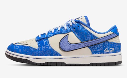 Nike has redesigned its Dunk Low sneaker in honor of Jackie Robinson. Dressed up in white and blue — classic colors of Robinson’s team, the Brooklyn Dodgers — the sneaker is set to debut on the 75th anniversary of the baseball player’s first official game, which made him the first Black player in Major League Baseball. A metallic font decorates the shoe’s overlays, spelling out one of Robinson’s legendary quotes: “I’m not concerned with your liking or disliking me. All I ask is that you respect me as a human being.”