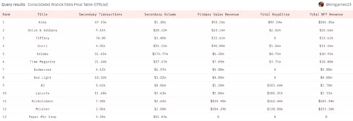 According to Dune Analytics, roughly half of Nike’s NFT revenue was generated by primary sales while the other half is from royalties. In total, Nike NFTs have generated $1 billion in revenue on the secondary market, of which the Swoosh took $93 million. The brand tops others like Dolce & Gabbana, which brought in a total NFT-related revenue of $25.66 billion, according to Dune Analytics.