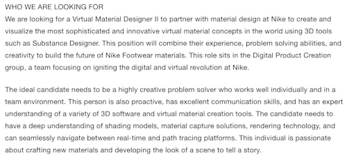 Already, Nike is seeking employees for its digital world — the company is currently hiring for a number of “virtual material designer” roles, including specifically for footwear, The Fashion Law reports. One job listing says the individual “will play a key role in redefining [Nike’s] digital world, ushering [the brand] into the metaverse.”