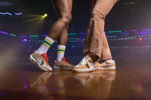 Elements on both shoes, like metal eyelets, debossed suede, tumbled leather, and popped laces nod to ‘70s roller skating culture. Iced outsoles, particularly noticeable on the Air Max 97, hint at the translucent wheels often seen on skateboards and roller skates.