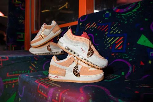 Each pair in the collection sports warm hits of red, tangerine, and peach, reminiscent of sunset skate adventures. The Air Force 1 Shadow accents its white base with peach suede overlays and a gray Swoosh, while the Air Max 97 flaunts a bright red tongue amongst a peach and gray upper.