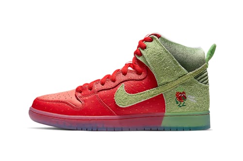 Nike SB’s mythical “Strawberry Cough” Dunk — originally slated for release in 2020 — is finally dropping this month. Designed by Todd Bratrud, the artist behind other weed-themed sneakers like the “White Widow” and infamous “Skunk” Dunk, the “Strawberry Cough” Dunk commemorates the cannabis strain it’s named after with hairy green suede panels and a coughing strawberry graphic.