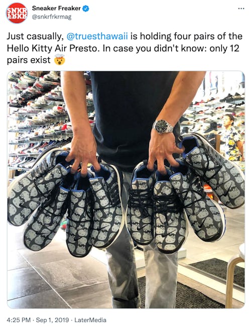 Back in 2004, Nike helped Hello Kitty celebrate its 30th anniversary by producing an extremely limited run of Air Prestos. The original plan was to release 500 pairs each of four different versions of the Presto featuring the popular Japanese character, but only 12 pairs in total ended up being given to to select friends and family.