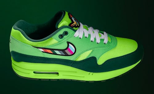 The Air Max 1 sneaker is covered in shades of green from lime to forest to align with the University of Oregon’s colors, complete with a multi-color Swoosh. A big duck logo resembling the NFT sits on the tongue in the same rainbow palette, matching the insole.