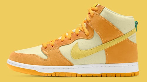 Nike’s all-fruit meal starts with a course of the SB Dunk High “Pineapple,” which is dressed in a pale yellow upper with orange soles and overlays. The Swoosh comes in bright yellow to continue the tonal arrangement, while green heel tabs break up the sunny color scheme as a nod to pineapple’s leafy crown.