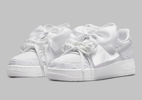The latest version of the sneaker is no exception. Oversized bows, lace eyelets, and pleated white panels now cover the shoe’s upper, resulting in a bold yet delicate AF1. An hourglass logo — first seen on another unreleased Air Force 1 — sits at the heel, suggesting the ornate sneaker is part of a larger women’s collection.