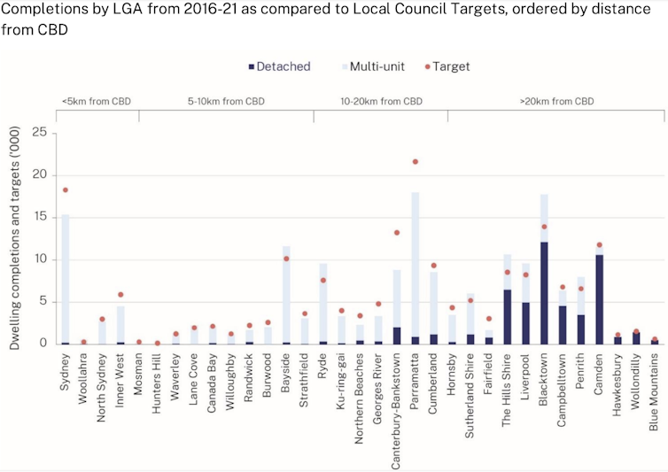 A recent NSW Productivity Commission report shows less than 20% of new dwellings were built within 10 kilometres of the CBD between 2016 and 2021. Unmet demand is greatest in the inner city. As the chart below shows, most residential development has been in the outer suburbs, 30-40km from the city centre.