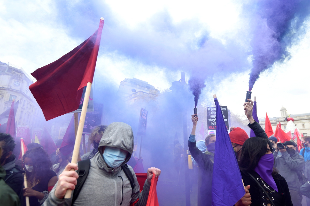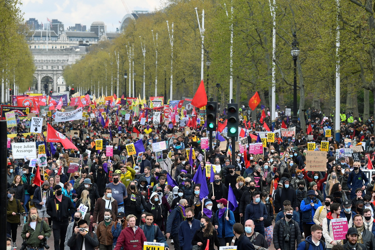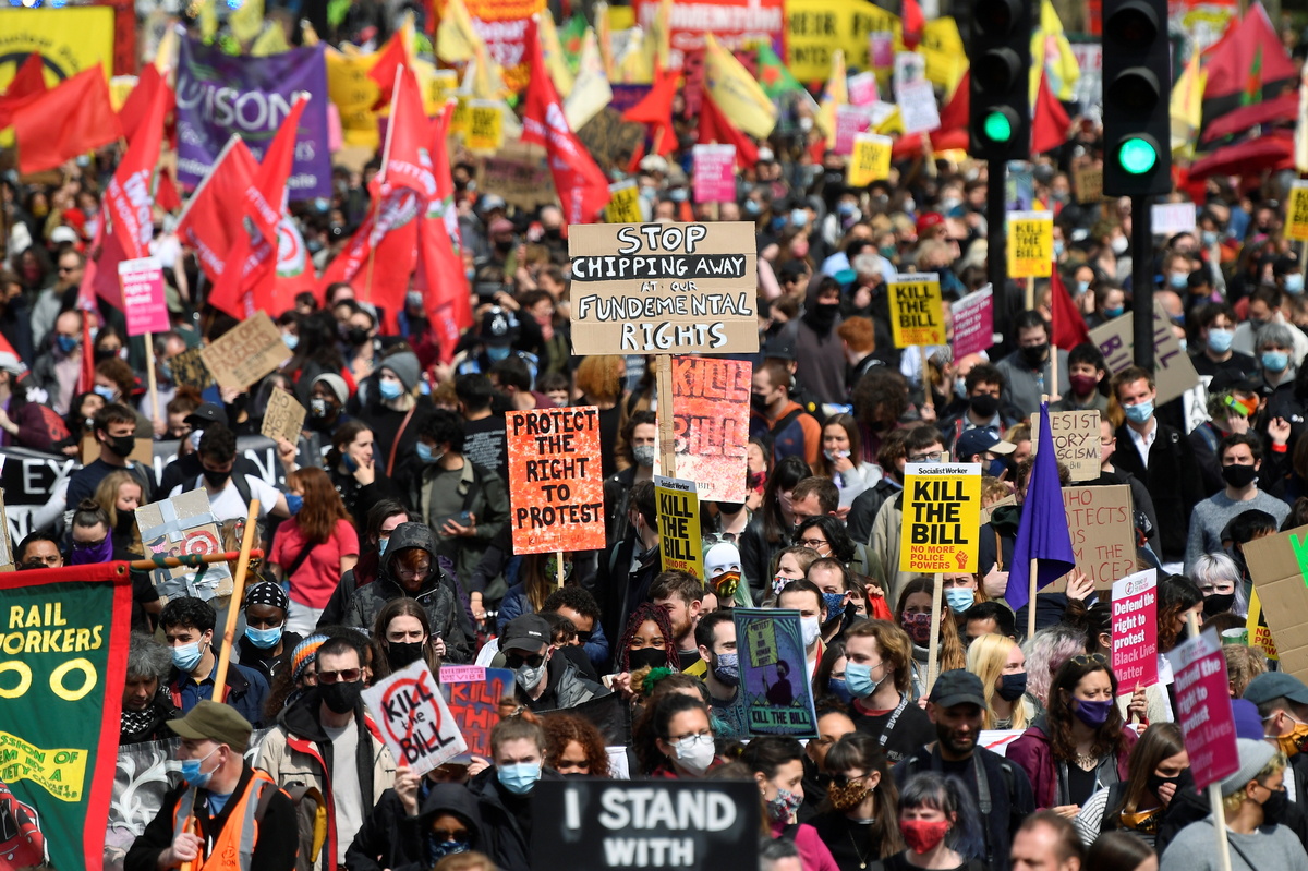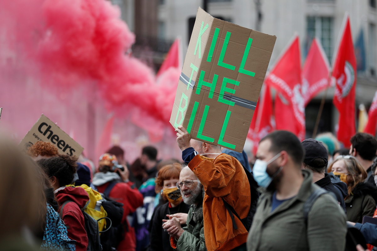 More than 1,000 people marched through central London and chanted "Kill the Bill" outside government buildings, as well as dancing to music played from a bus.