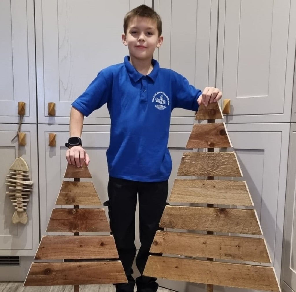 A nine-year-old entrepreneur is brightening up his village by selling hand-crafted wooden Christmas trees.