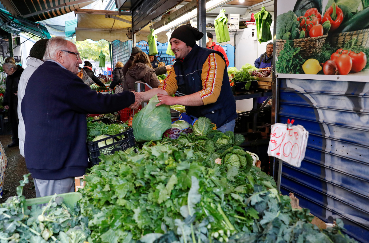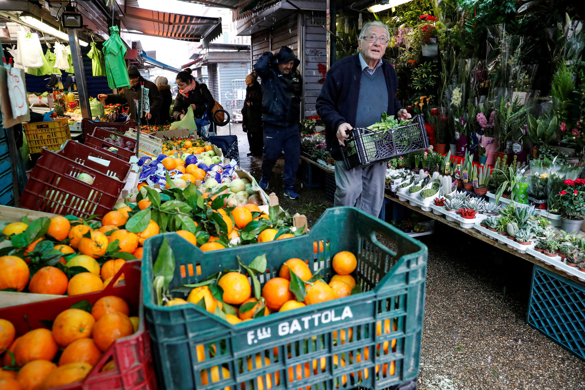 Dino Impagliazzo, Rome's 90-year-old 'chef of the poor', is greeted as he collects leftover fruits and vegetables from a market stall in Rome, Italy, January 18, 2020. Picture taken January 18, 2020. REUTERS/Remo Casilli