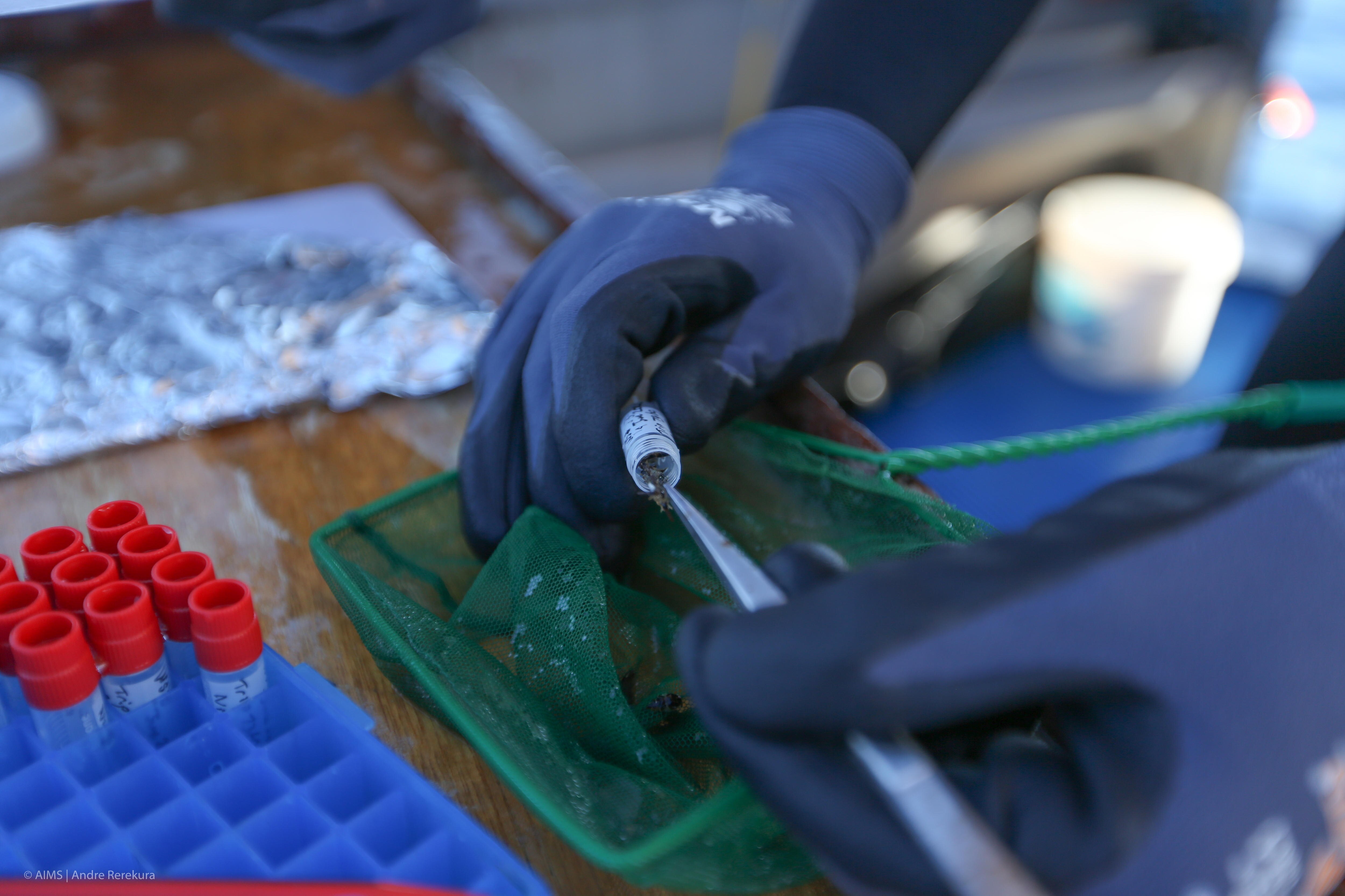 The scientific practice was recently caught on camera for the new ABC documentary series Ningaloo Nyinggulu, but visitors to the region are being urged to follow Australian guidelines to not touch or swim too close to the whale sharks.