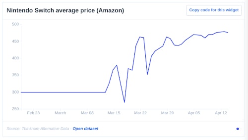 Thinknum has been tracking the average selling price of a Nintendo Switch on Amazon, where third-party sellers can set their own prices. The price gouging was first reported on two weeks ago when sellers were seen selling the Switch, retail price $299, for as much as $600.