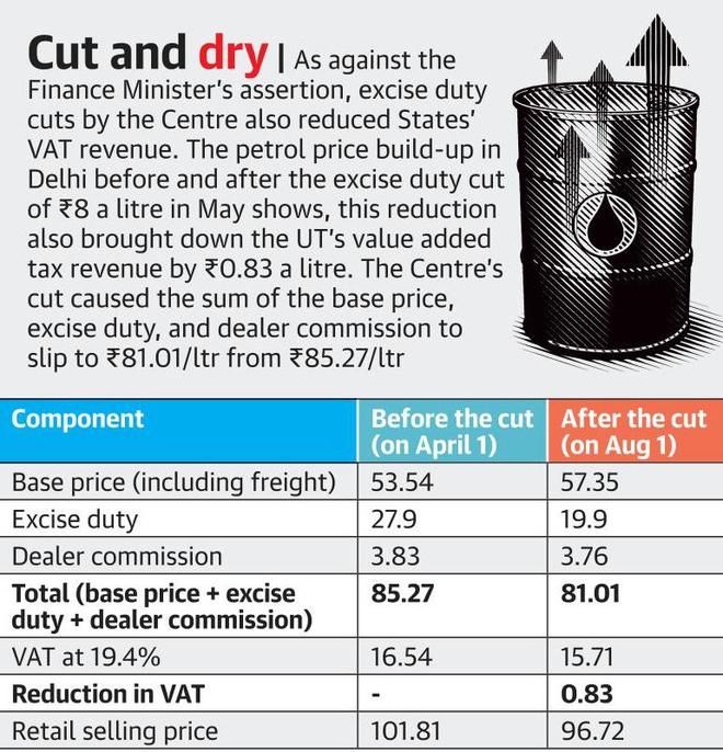 While the Centre had cut petroleum taxes for consumers recently on two occasions in view of surging global prices, Ms. Sitharaman pointed out that several States had not offered any relief to their residents who were suffering because of this.