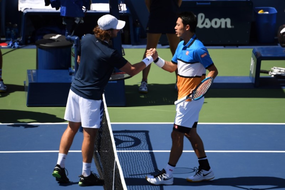 NEW YORK (Reuters) - Kei Nishikori became the first man to advance to the U.S. Open second round as the 2014 finalist beat qualifier Marco Trungelliti, who was forced to retire with the Japanese leading 6-1 4-1 on Monday.