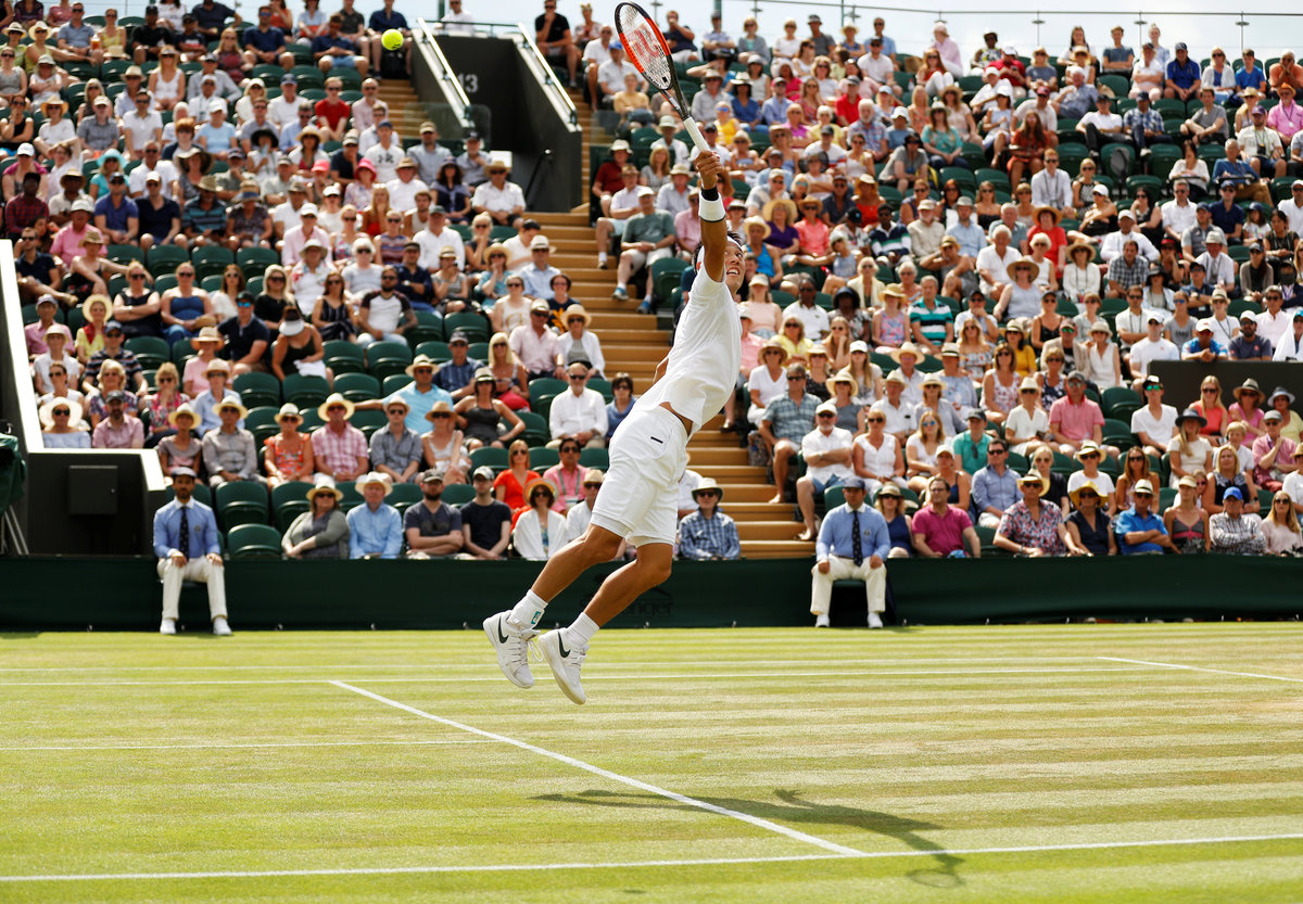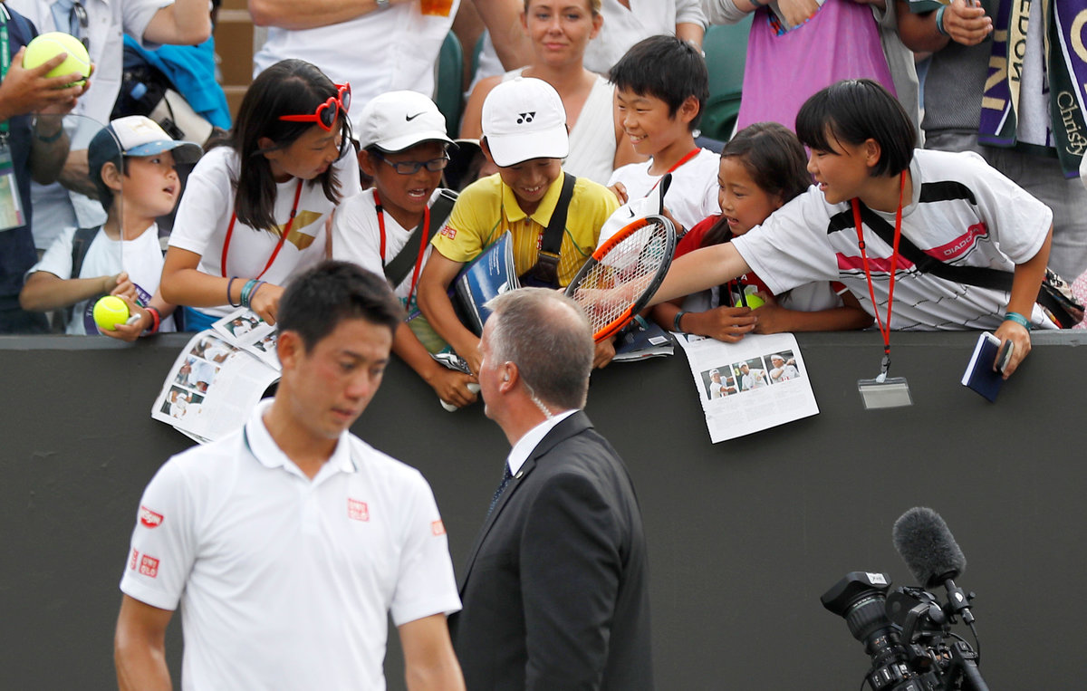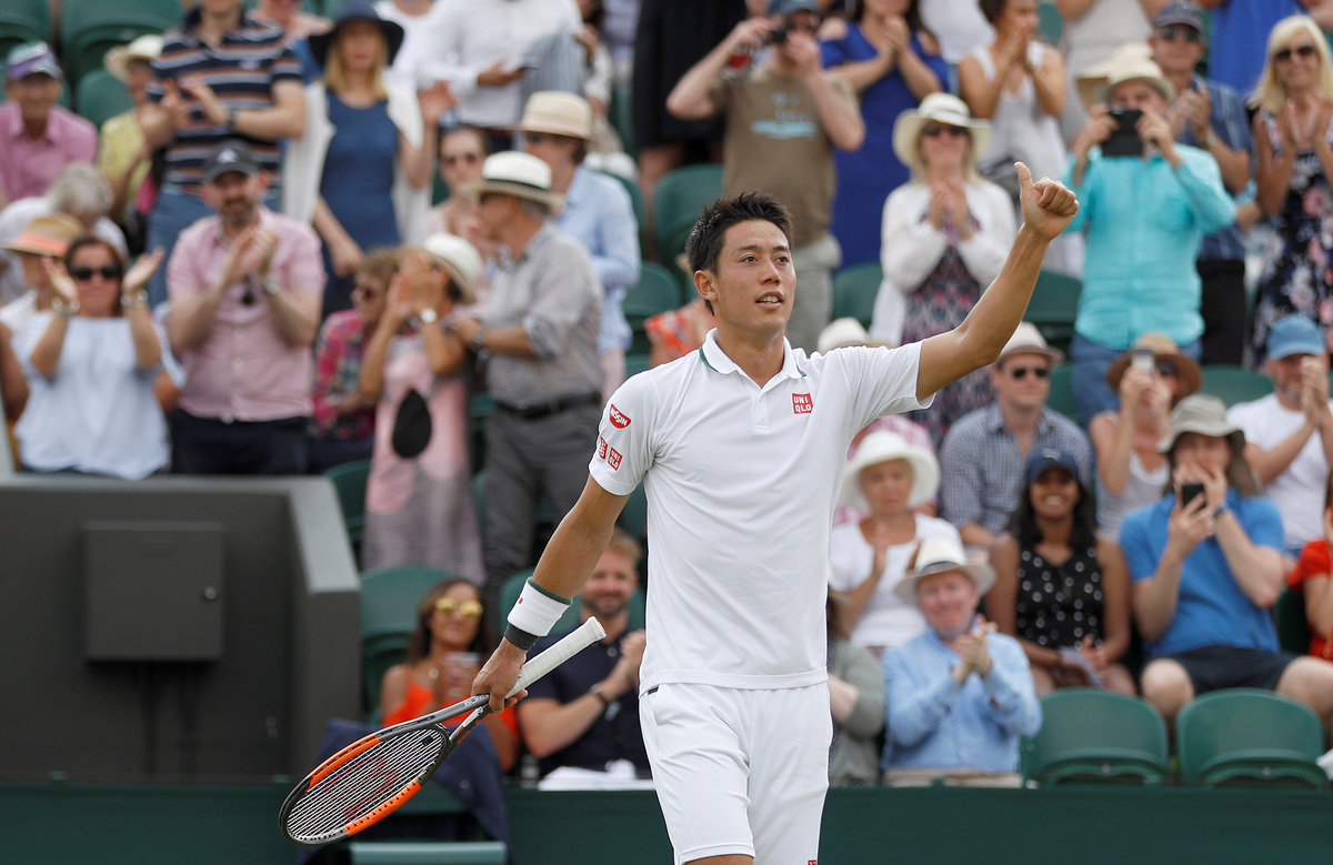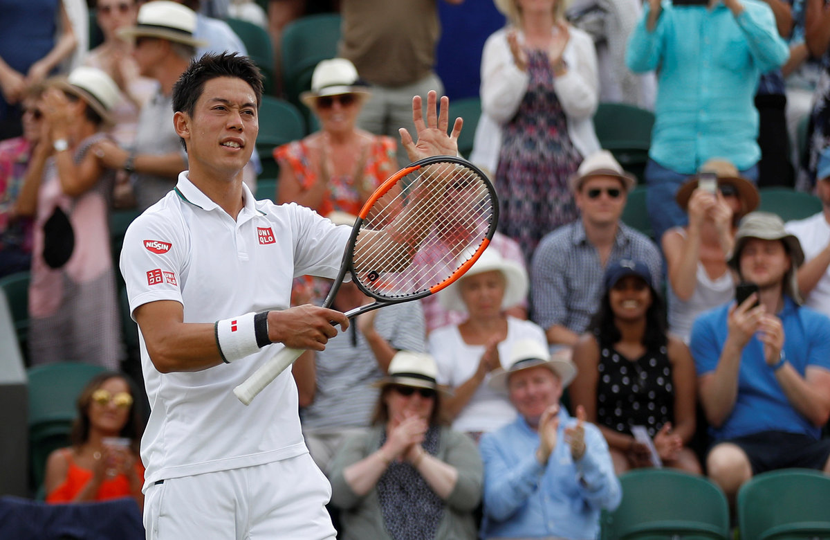 LONDON (Reuters) - Kei Nishikori overcame elbow trouble in the opening set to win a marathon match 4-6 7-6(5) 7-6(10) 6-1 against a limping Ernests Gulbis and reach his first Wimbledon quarter-final at the tenth attempt on Monday.
