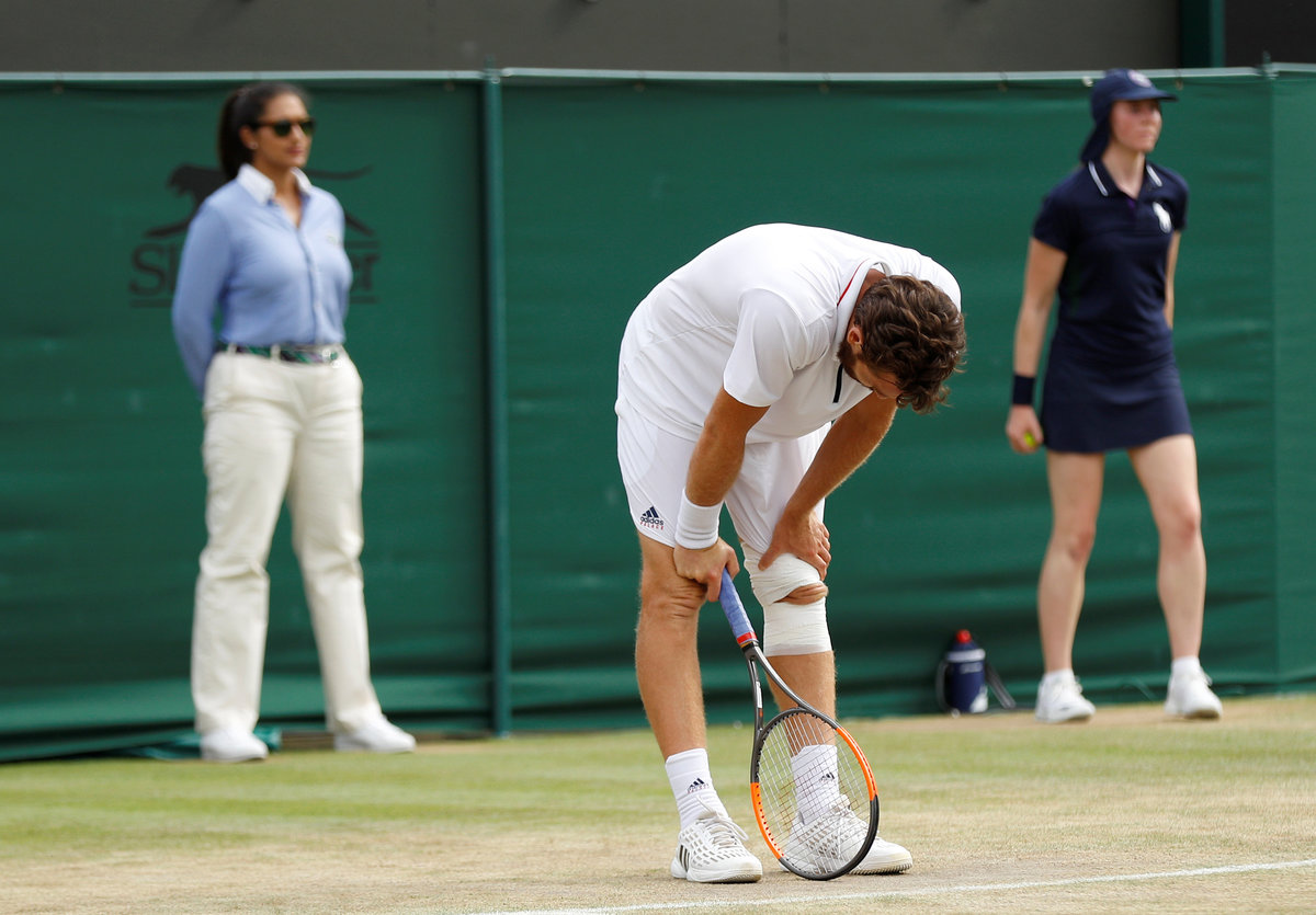Latvian qualifier Gulbis, a former world number 10 also looking for his first quarter-final at Wimbledon, gave as good as he got in a ding-dong battle over three sets before hurting his knee in the third-set tiebreak.