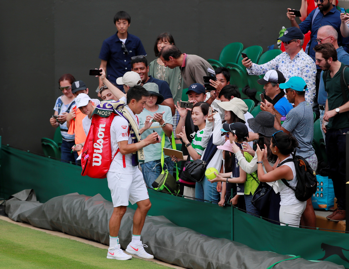 Jul 6, 2019; London, United Kingdom; Steve Johnson (USA) in action during his match against Kei Nishikori (JAP) on day six at the All England Lawn and Croquet Club. Mandatory Credit: Susan Mullane-USA TODAY SportsJul 6, 2019; London, United Kingdom; Kei Nishikori (JAP) in action during his match against Steve Johnson (USA) on day six at the All England Lawn and Croquet Club. Mandatory Credit: Susan Mullane-USA TODAY SportsJul 6, 2019; London, United Kingdom; Steve Johnson (USA) in action during his match against Kei Nishikori (JAP) on day six at the All England Lawn and Croquet Club. Mandatory Credit: Susan Mullane-USA TODAY SportsTennis - Wimbledon - All England Lawn Tennis and Croquet Club, London, Britain - July 6, 2019 Japan's Kei Nishikori signs autographs for fans after winning his third round match against Steve Johnson of the U.S. REUTERS/Andrew Couldridge