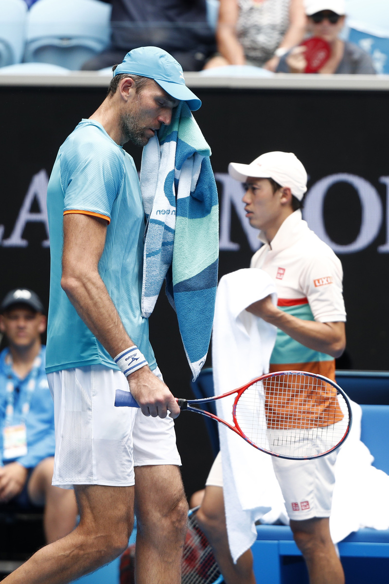 Against Karlovic, however, Nishikori squandered a two-set lead before closing out a tense tiebreak to prevail 6-3 7-6(6) 5-7 5-7 7-6(7) on a sweltering day at Margaret Court Arena.