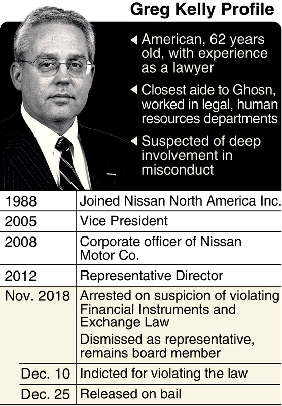 Within Nissan Motor Co., former representative director Greg Kelly had a high position but a low profile, with few people clearly aware of what he was doing. The closest aide to former Chairman Carlos Ghosn, and arrested on the same day as him, Kelly was released on bail Tuesday.
