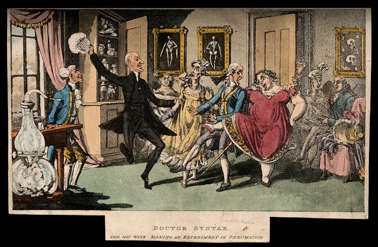 A young man breathes deeply from a gas-filled bag. He begins to feel a pleasurable sensation “particularly in the chest and extremities” before dancing around and then collapsing in a heap. A few minutes later he comes to and is consumed by a fit of giggles. The young man is a chemist, living in Bristol and his name is Humphry Davy. The year is 1799 and Davy has just discovered the euphoric effects of nitrous oxide (N₂O), which he names “laughing gas”.