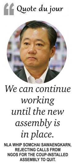 Another key assembly figure, NLA whip Somchai Sawaengkarn, told the protesters the 2017 constitution allows the coup-installed NLA to work until the new assembly is in place but that law-vetting will continue until March 15. He added that there are about 20 bills currently being mulled by the assembly.