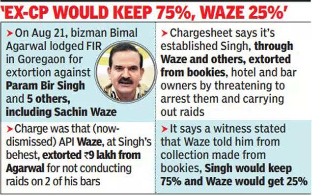 MUMBAI: In the first chargesheet submitted against former city police chief Param Bir Singh before Esplanade court, the crime branch on Saturday alleged that from statements of witnesses, it has been established that he was the "Number 1" at whose behest dismissed API Sachin Waze was extorting money from bookies and hotel and bar owners.