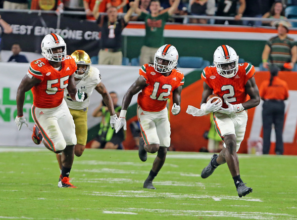 The Hurricanes on this night, held Notre Dame to just 109 rushing yards and Josh Adams, who entered the game as a potential Heisman Trophy candidate that had scored on seven runs of at least 60 yards, was held in check, finishing with just 40 yards. Wimbush, meanwhile, was intercepted three times in the first half, first by Jaquan Johnson, then by Malek Young.