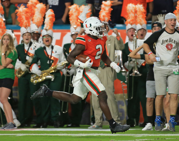 On that one, with just 22 seconds left before the half and with Ian Book in for Wimbush, freshman Trajan Bandy snagged the ball and scored on a 65-yard return, giving the Hurricanes their first defensive score of the season.