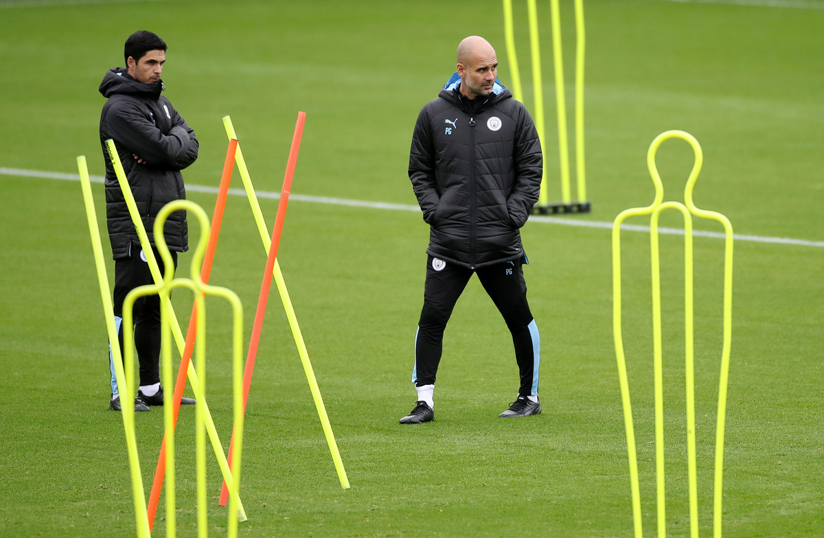 Soccer Football - Champions League - Manchester City Training - Etihad Campus, Manchester, Britain - September 30, 2019 Manchester City manager Pep Guardiola and assistant manager Mikel Arteta during training Action Images via Reuters/Carl Recine