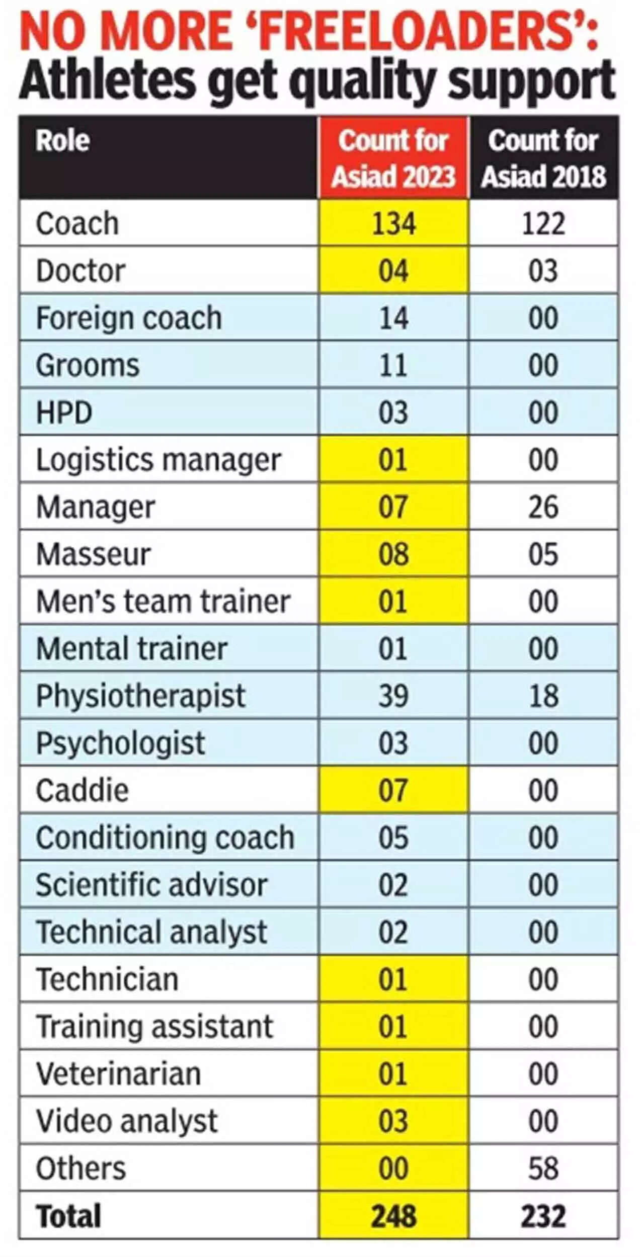 TOI has accessed the list of coaches and support staff finalised for the Asiad and there are no extra officials named. The ministry has also effectively ruled out the role of team managers, drastically cutting down the number of such officials.