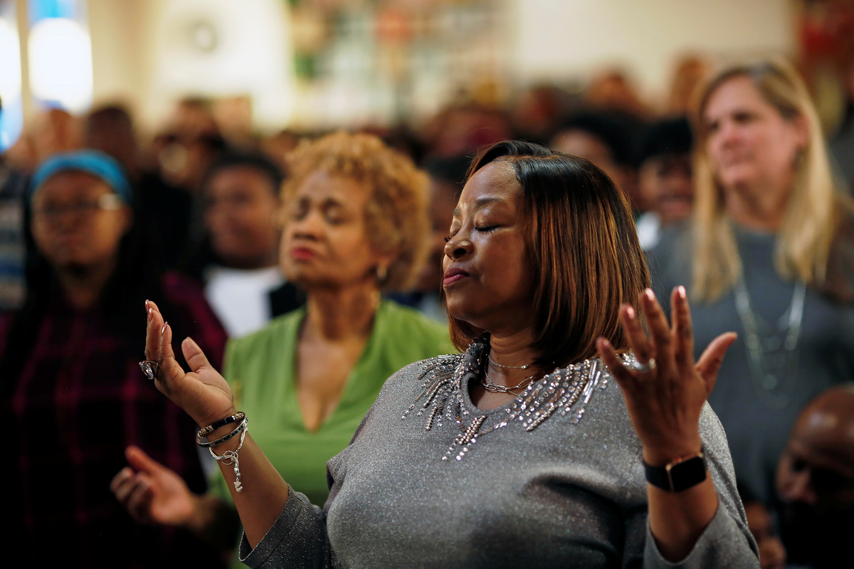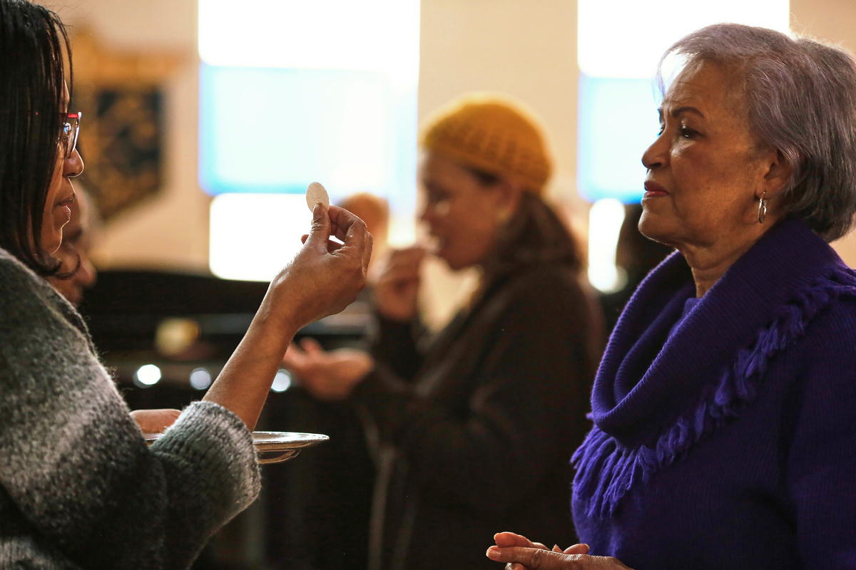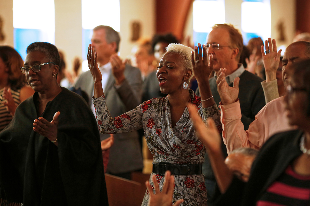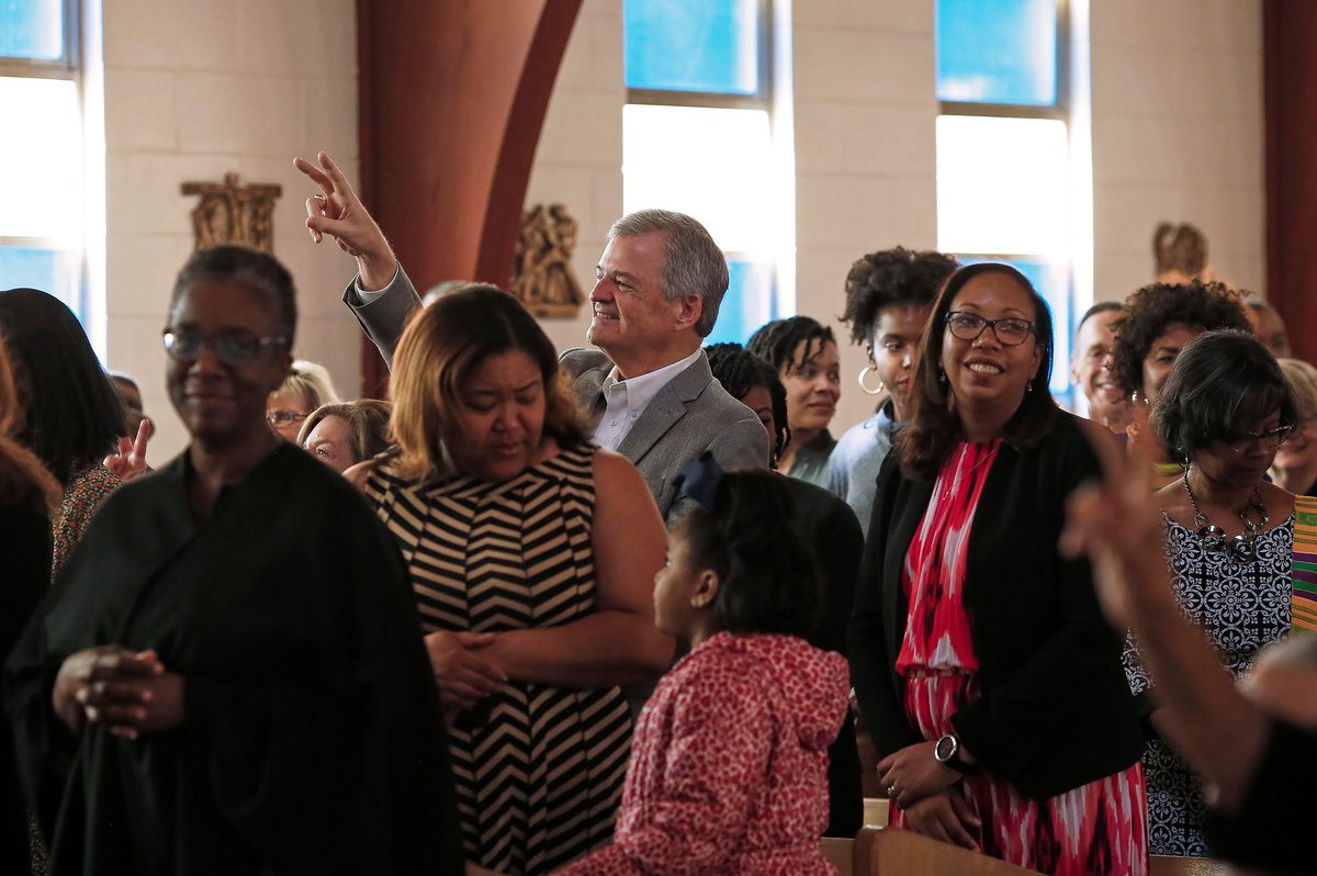 With a wide smile and arms outstretched, but quickly dropped into double elbow bumps, James Harper warmly greets fellow congregants at Our Lady of Lourdes Catholic Church on Sunday in Atlanta's Old Fourth Ward neighbourhood.