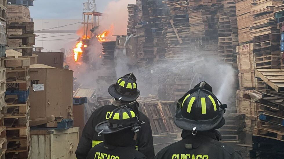 The fire broke out about 7:30 p.m. in the outdoor lot of a business that manufactures pallets at West 25th and South Rockwell streets, according to Chicago Fire Department officials.