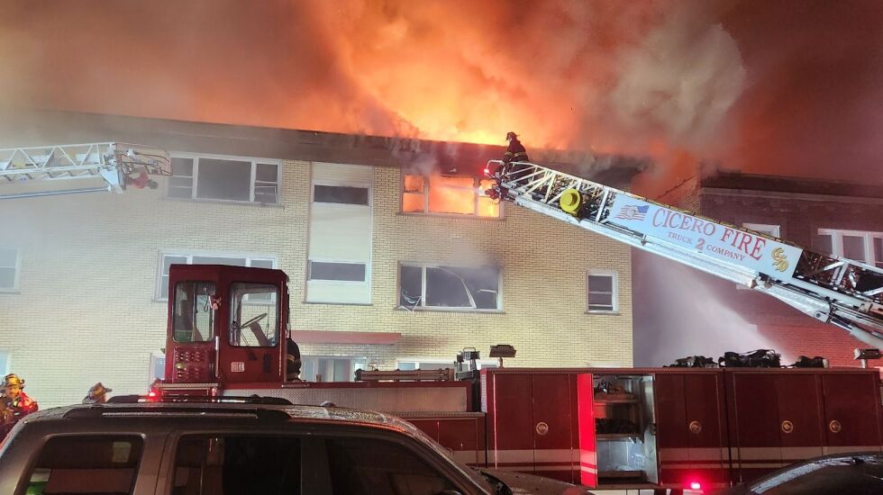 Crews remain on the scene of an apartment fire at a Cicero apartment building early Friday, according to city officials.