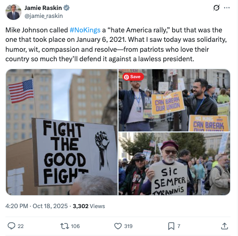 “Mike Johnson called #NoKings a “hate America rally,” but that was the one that took place on January 6, 2021,” Raskin wrote on X, referring to the pro-Trump insurrection at the U.S. Capitol. “What I saw today was solidarity, humor, wit, compassion and resolve—from patriots who love their country so much they’ll defend it against a lawless president.”