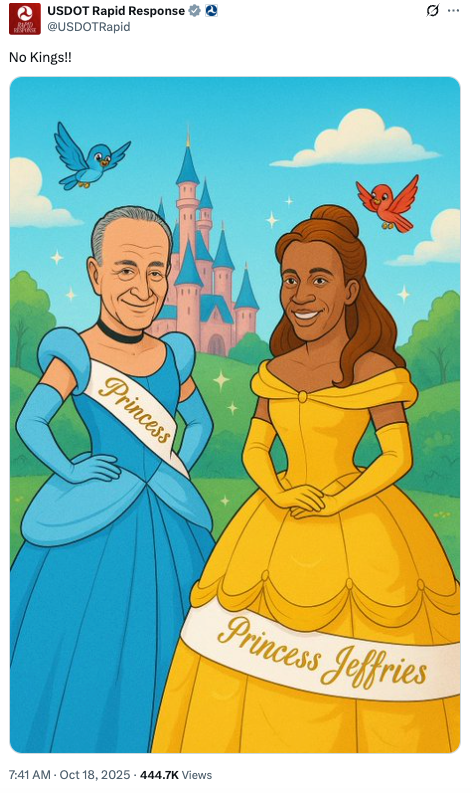 “Avoid ‘No Kings’ (the Hate America) protests! The Left is very, very angry that Trump keeps winning. Good chance these won’t be ‘peaceful’. Stay home, watch football…” Florida GOP Rep. Jimmy Patronis wrote on X.