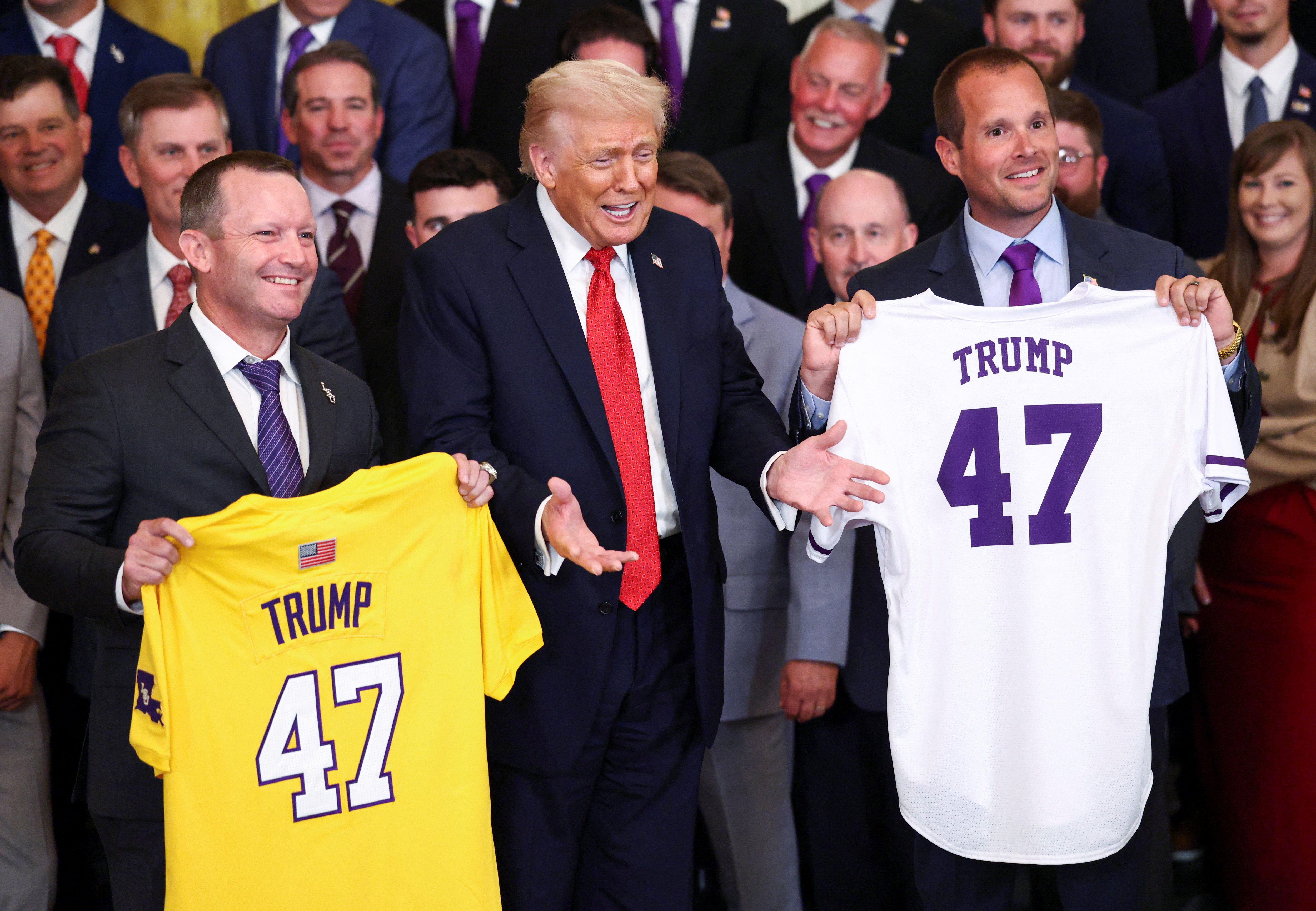22:07 , Katie HawkinsonThe coaches for the Louisiana State University Tigers and the LSU Shreveport Pilots gifted President Donald Trump team jerseys, emblazoned with his name and “47” on the back.