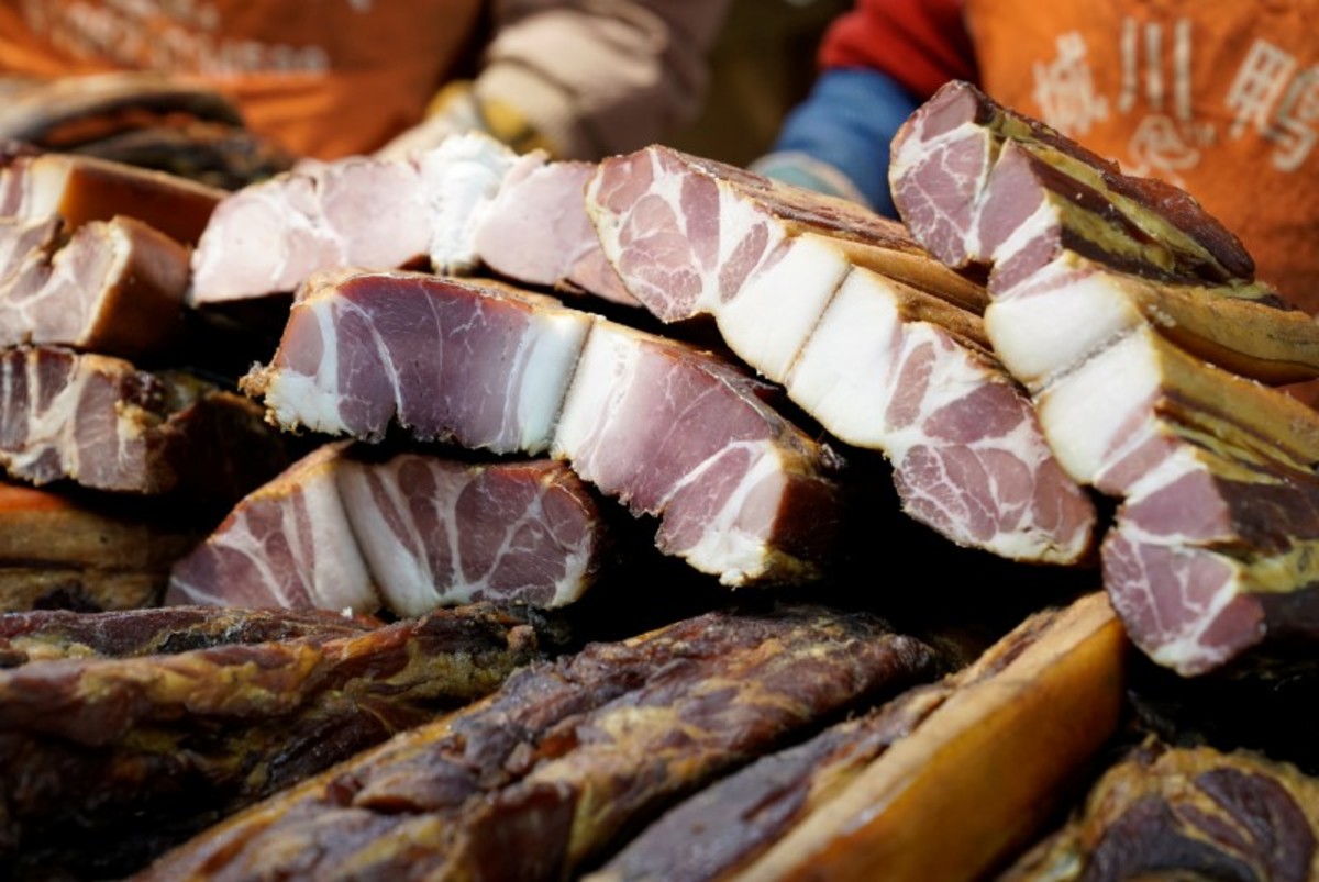 China is the world's top pork consumer and la rou and dried sausage are eaten all over the country. Typically made during winter ahead of the Lunar New Year, strips of pork belly and leg meat are salted or smoked before being left to hang in the sun for days, resulting in dark, hard, salty or spicy meat.