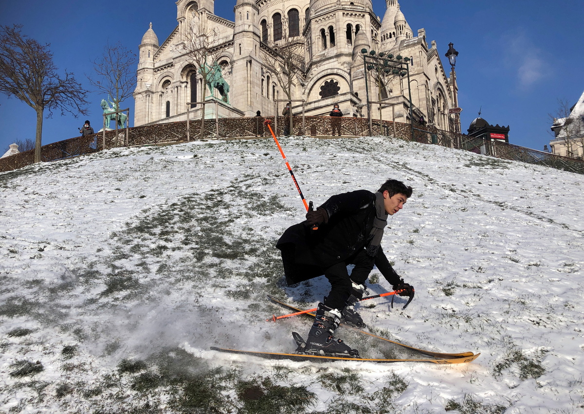 France's ski resorts are closed because of the COVID-19 pandemic, so one French winter sports enthusiast did the next best thing on Wednesday - skiing down a steep street in Paris.